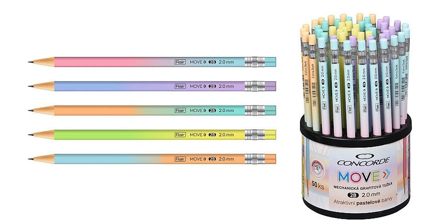 Creion mecanic elegant cu grafit CONCORDE Move, cu vârf de 2,0 mm în culori pastelate, oferă mină extra lungă de 120 mm, corp fără lemn pentru ascuțire ușoară și mecanism cu buton pentru avans comod al minei 2B.
