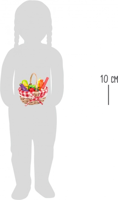 Acest set de calitate include un coș împletit cu țesătură în carouri și piese din lemn reprezentând fructe și legume (căpșuni, morcov, vânătă, știulete de porumb, măr, banană etc.). Piesele sunt unite cu scai, astfel încât copiii le pot „tăia” în siguranță cu cuțitul de lemn și le pot reuni din nou. Un accesoriu perfect pentru bucătăria de jucărie și standul de cumpărături.