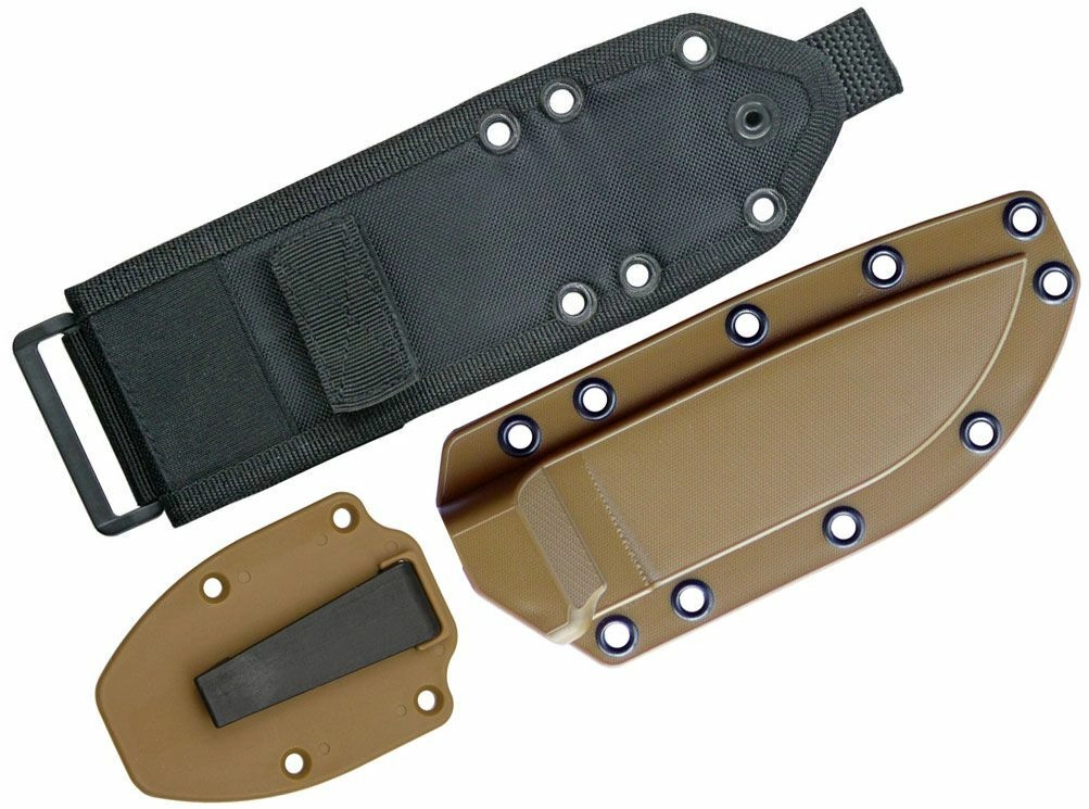 Lama din oțel carbon 1095 cu acoperire neagră pulbere taie excelent, se ascute ușor și suportă utilizare dură. Pentru o durată lungă de viață, este recomandat ca suprafața cuțitului să fie ocazional unsă cu ulei. Mânerul gri din Micarta este plăcut în mână, nu alunecă și are la capăt un orificiu pentru șnur. Teaca din plastic Coyote Tan este prevăzută cu posibilitatea de prindere pe MOLLE, astfel că poți fixa cuțitul cu ușurință pe echipament.