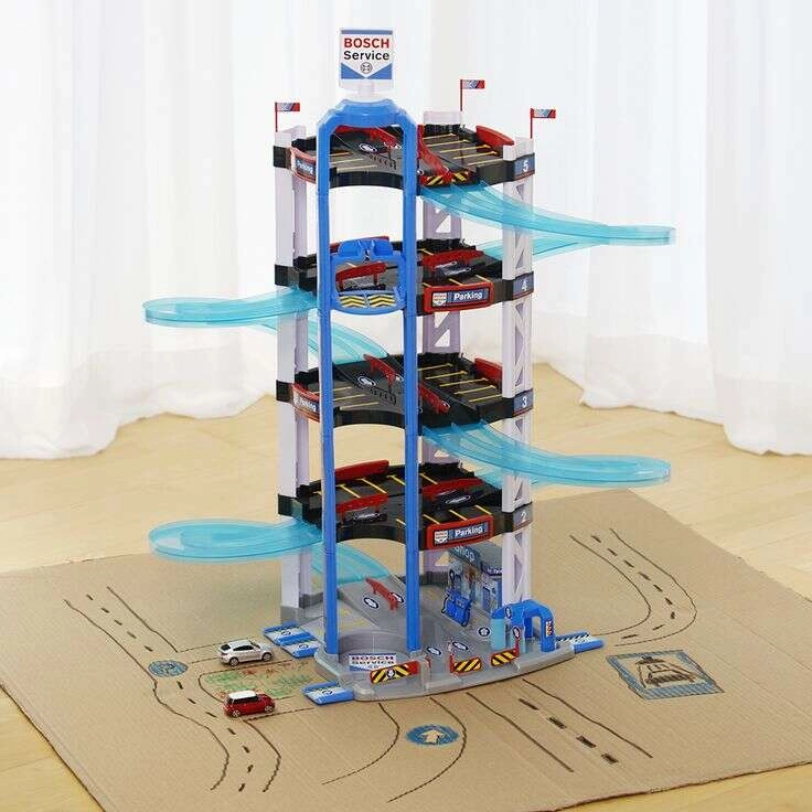 Acest complex robust de parcare pe 5 etaje BOSCH Service de la brandul Klein este creat pentru micii piloți. Oferă rampe spiralate duble semitransparente de la ultimul etaj până jos, lift acționat manual pentru transferul mașinuțelor între niveluri și start/finish de cursă pentru două mașinuțe. Pe fiecare nivel găsești suficiente locuri de parcare, iar la parter în plus zonă de service cu „stație” pentru joc realist.