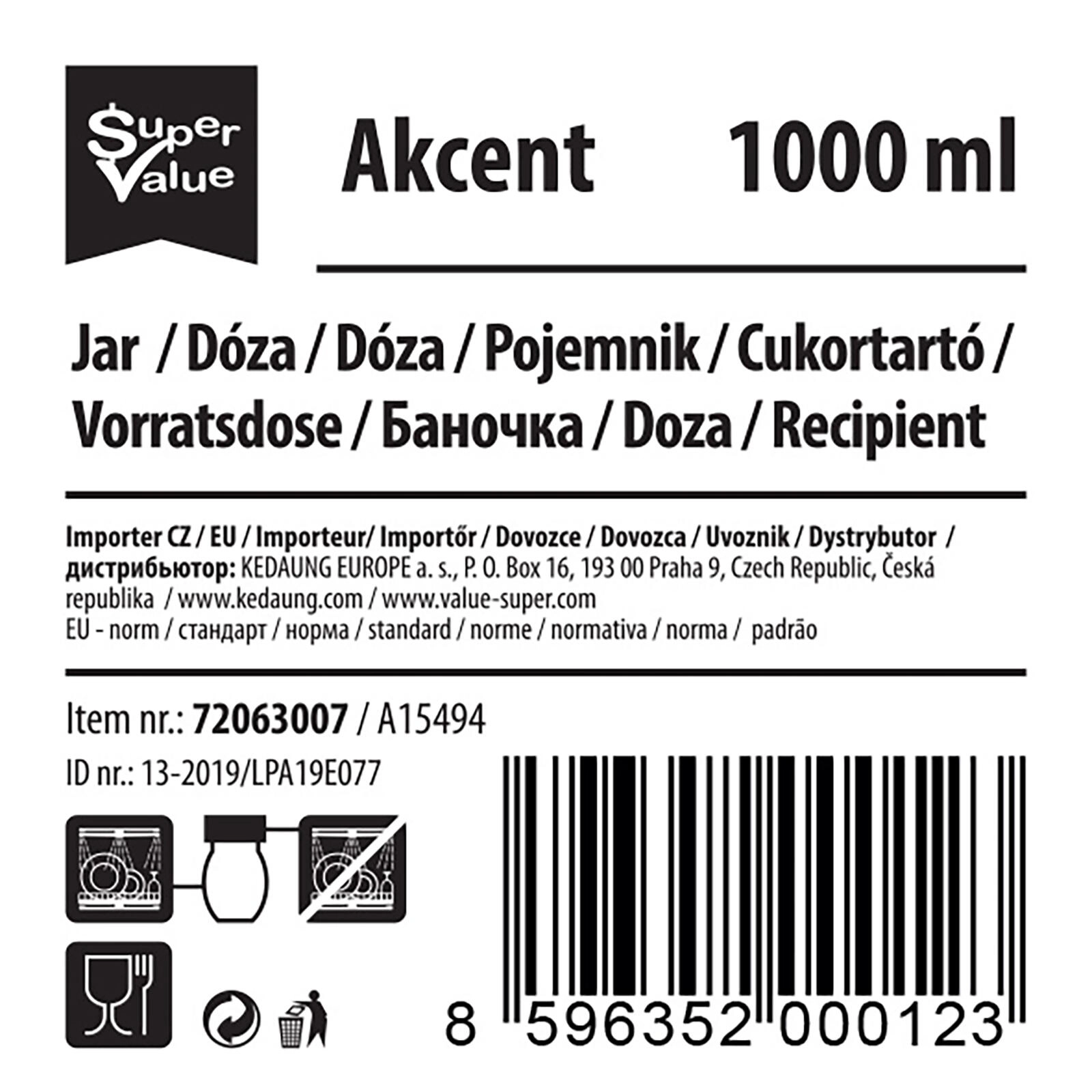 Practic borcan din sticlă AKCENT cu volum de 1 l și capac elegant din inox, ideal pentru organizarea zilnică a bucătăriei. Păstrează alimentele proaspete mai mult timp și depozitate ordonat. Potrivit pentru condimente, paste, leguminoase sau zahăr.