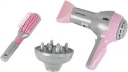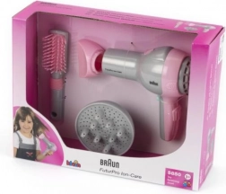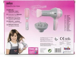Vă prezentăm uscătorul de păr pentru copii Braun cu difuzor și perie, ideal pentru micile coafori. Acest produs este realizat sub licența companiei Braun, conferindu-i un aspect realist, similar cu un aparat adevărat. Este complet sigur, uscătorul doar suflă aer fără a se încălzi, asigurând astfel siguranța mâinilor copiilor.