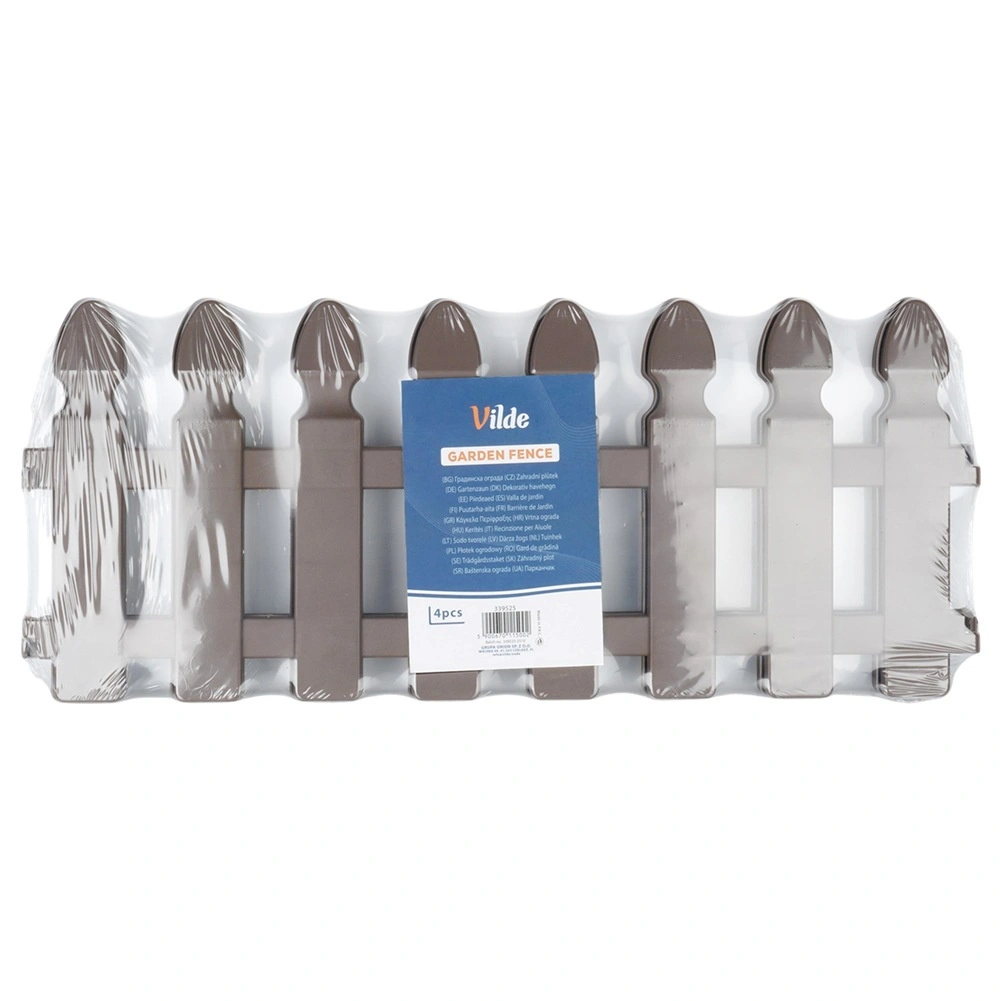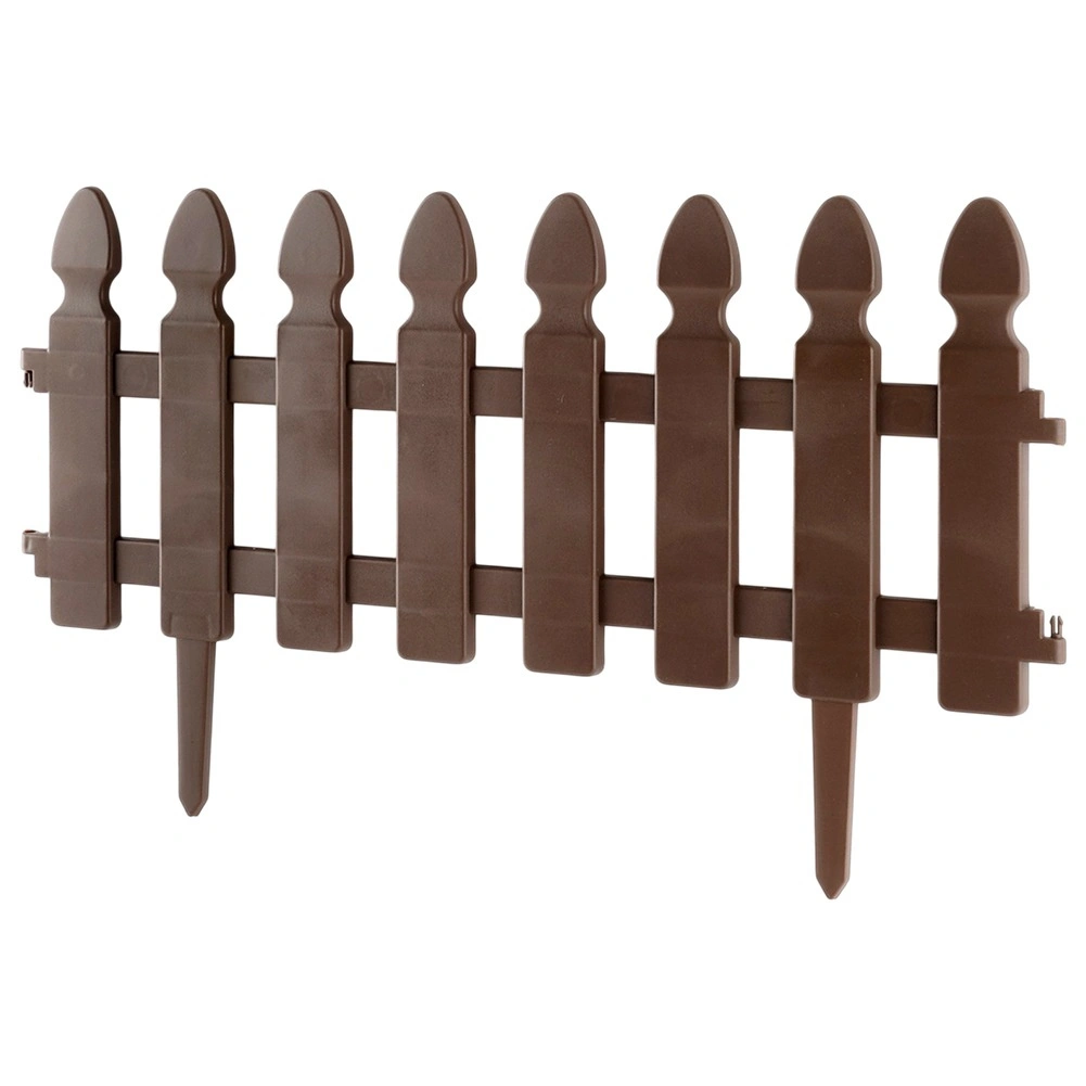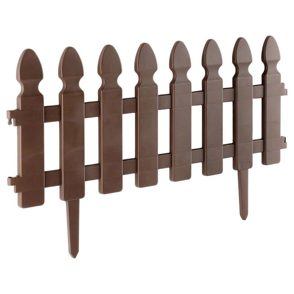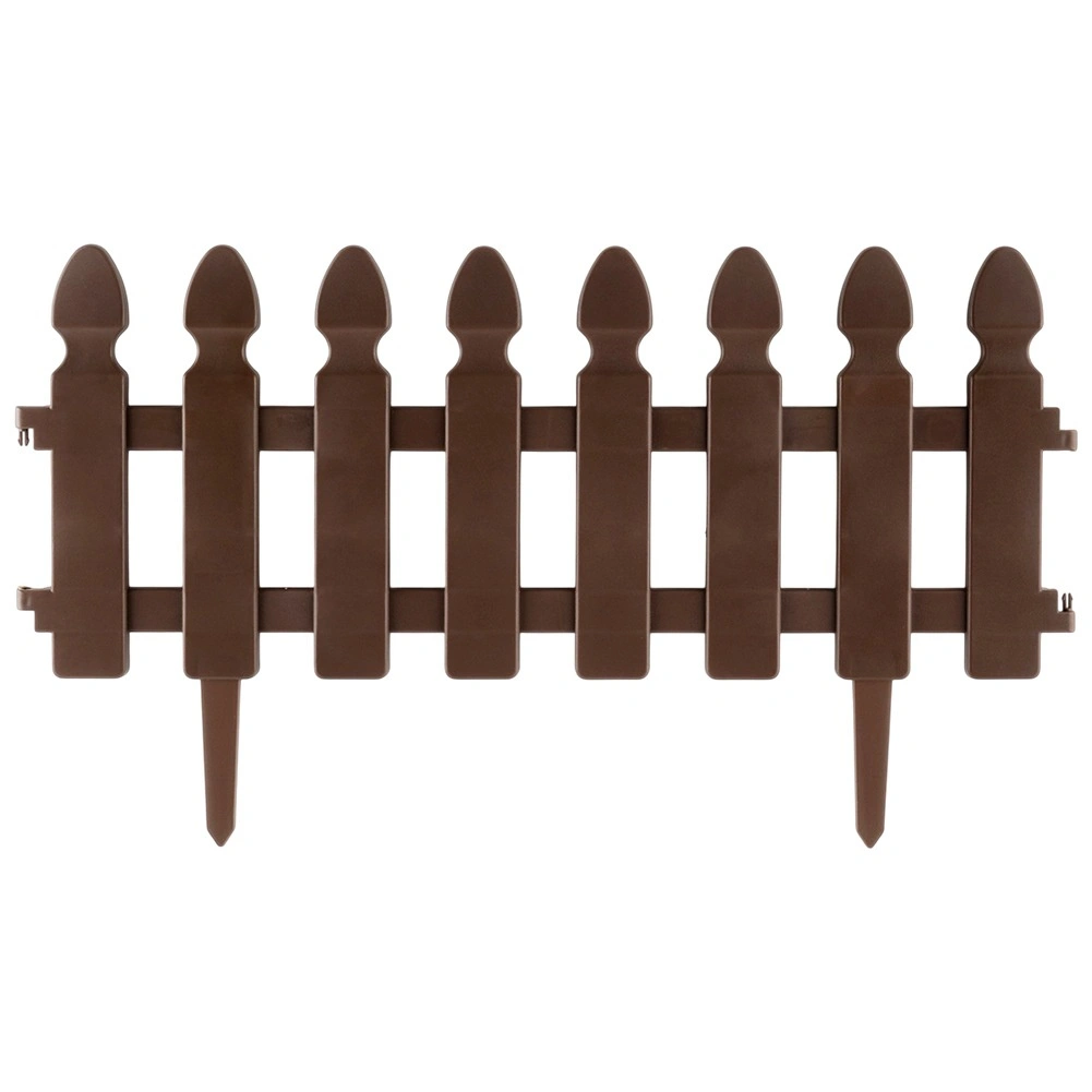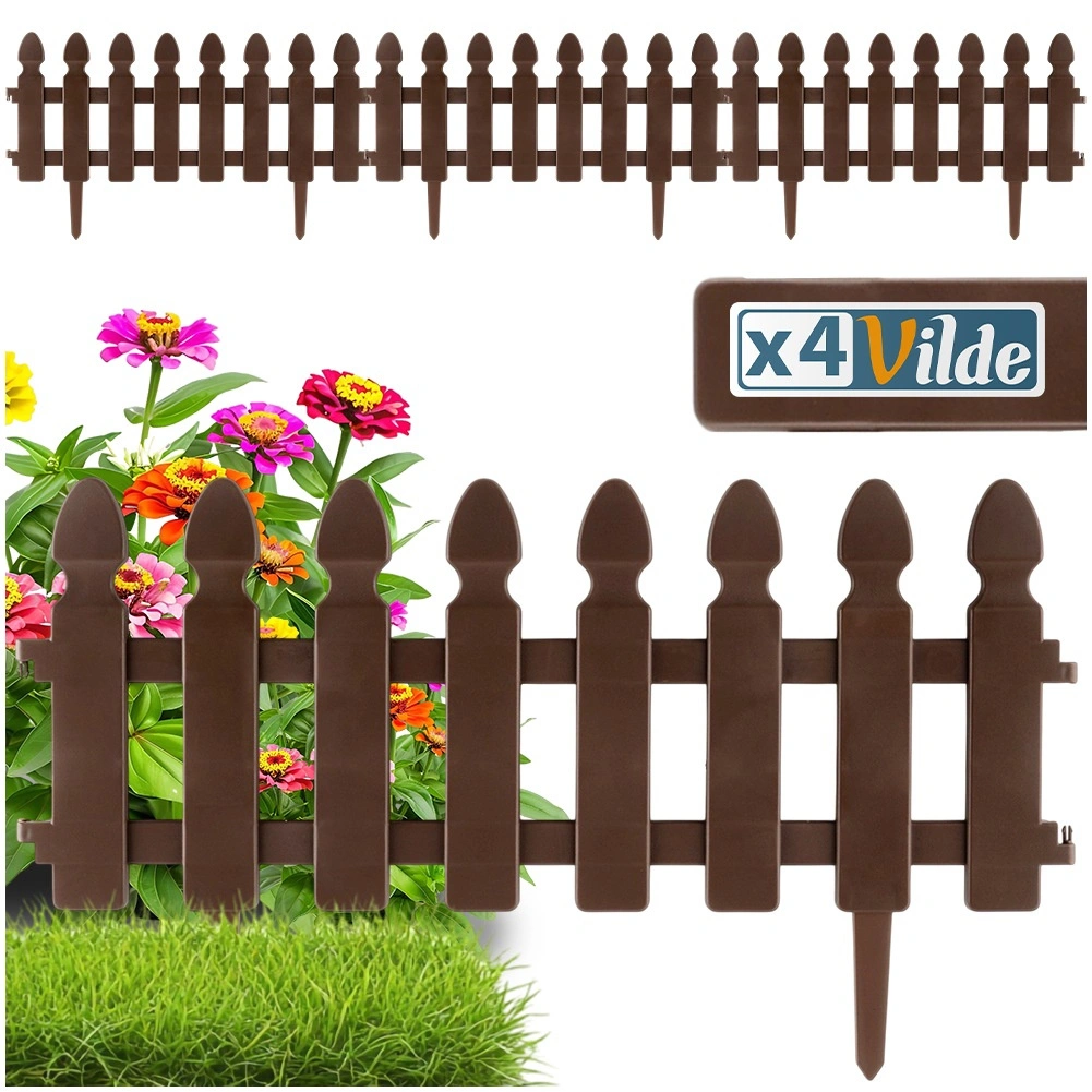 Gard decorativ de grădină, practic, în culoare maro, pentru delimitarea curată a straturilor, gazonului și aleilor. Set de 4 panouri cu dimensiunile 49 × 21 cm, cu țepușe pentru fixare fermă și cleme de interconectare, care permit crearea unui borduraj cu lungimea de până la 195 cm. Construcție rezistentă, stabilizată UV și rezistentă la îngheț pentru durată lungă de viață.