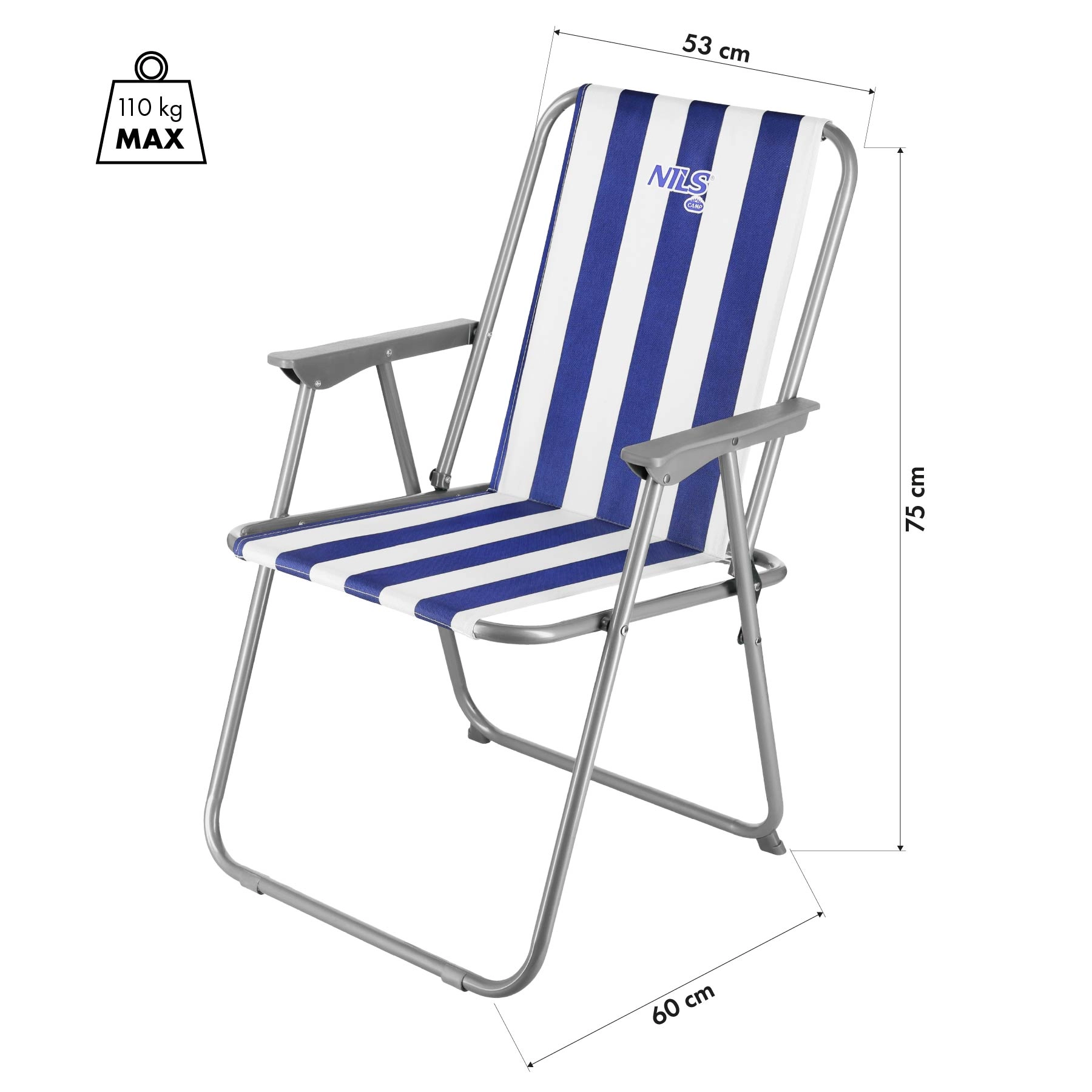 Scaunul pliabil NILS Camp, ușor și rezistent, este ideal pentru plajă, camping și grădină. Oferă o construcție robustă din oțel, ședere confortabilă și transport facil datorită dimensiunilor compacte după pliere. Sarcina maximă 110 kg și poliesterul 600D Oxford asigură durabilitate îndelungată și confort de încredere în aer liber sau pe balcon.
