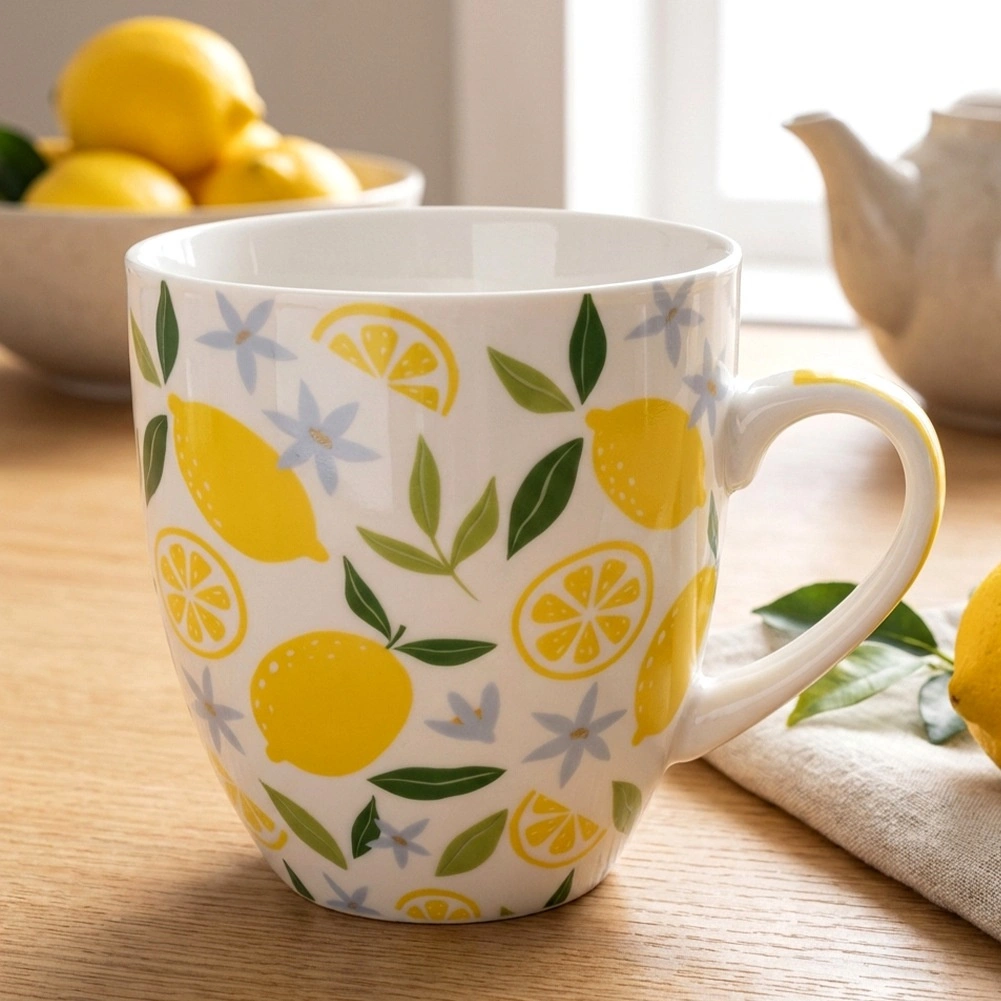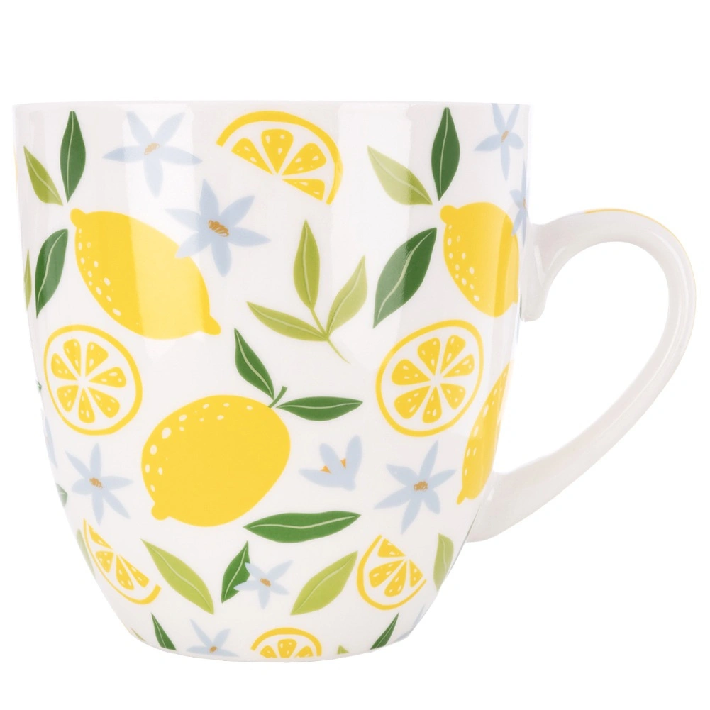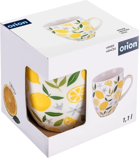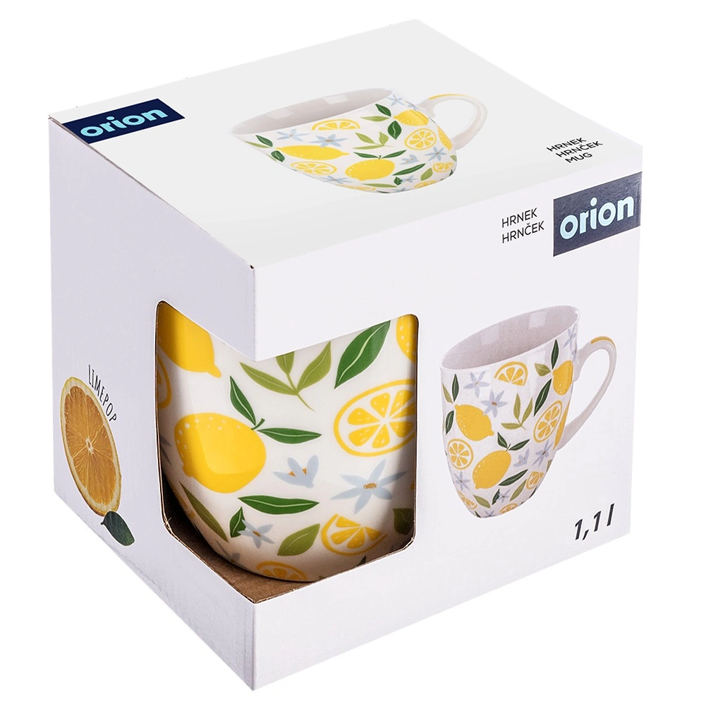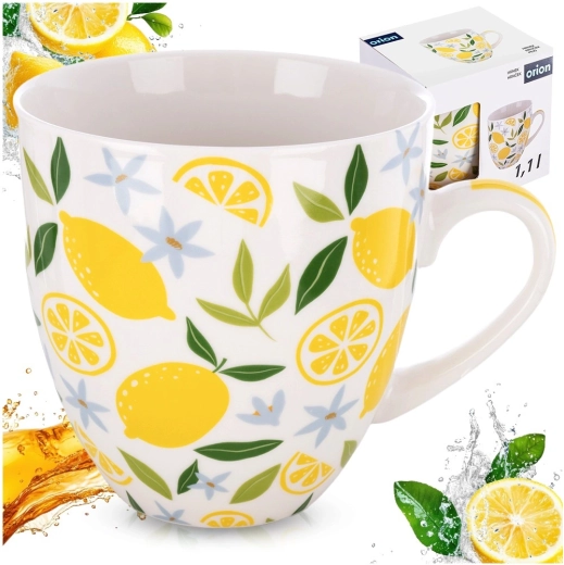 Cană mare din porțelan XXL cu volum de 1 l, cu un motiv vesel cu lămâi, ideală pentru cafea, ceai, cacao și băuturi reci. Are o toartă confortabilă, este potrivită pentru mașina de spălat vase și cuptorul cu microunde și, datorită glazurii de porțelan de calitate, oferă durată lungă de viață și contact sigur cu alimentele.