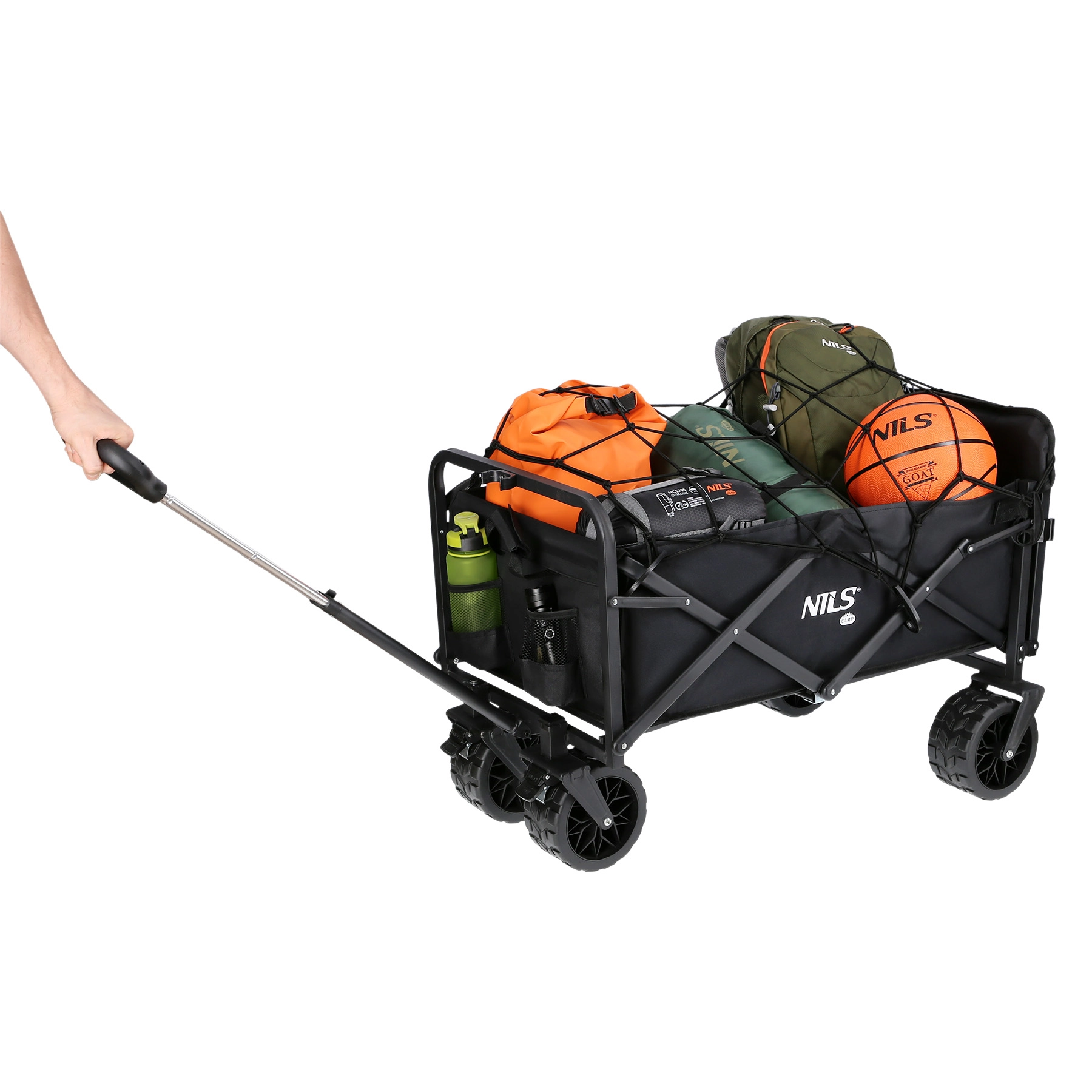 Căruciorul pliabil practic NILS Camp NC1608 este ajutorul ideal pentru plajă, camping și festivaluri. Oferă capacitate de 160 l, sarcină maximă de până la 100 kg, mâner telescopic pentru manevrare ușoară și roți late de 7" pentru rulare lină chiar și pe nisip. Panou spate rabatabil, buzunare pentru băuturi și buzunar interior pentru organizare perfectă. Datorită pliării rapide, sistemului de blocare și genții incluse, se transportă și se depozitează ușor.
