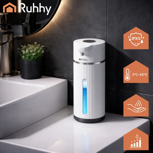 Dozatorul modern de săpun fără atingere RUHHY, cu o capacitate de 420 ml, asigură igienă maximă datorită senzorului cu infraroșu. Oferă 4 niveluri de dozare, timp de răspuns de 0,25 s, afișaj LED pentru monitorizare și baterie reîncărcabilă de 1200 mAh pentru până la 5000 de doze. Datorită rezistenței la apă IPX5, este ideal atât pentru baie, cât și pentru bucătărie, iar încărcarea USB‑C face utilizarea zilnică mai ușoară.