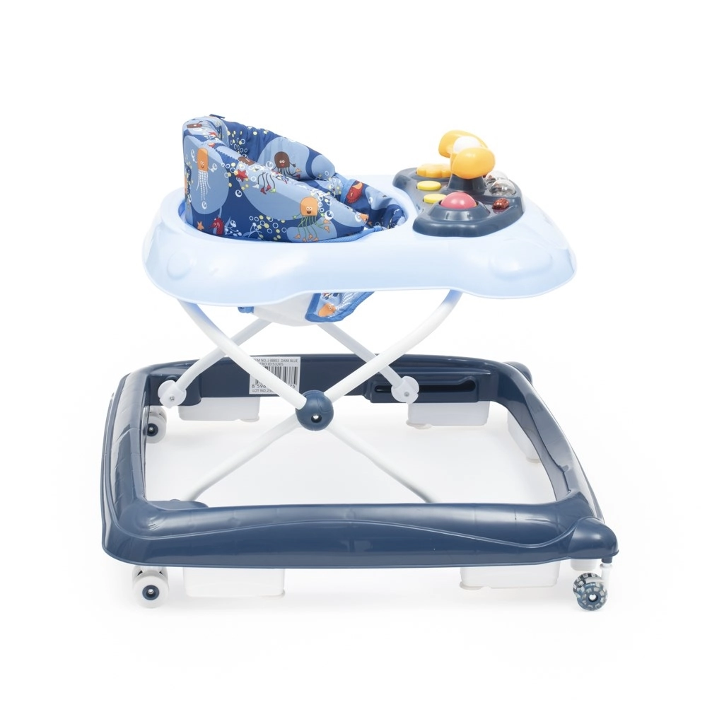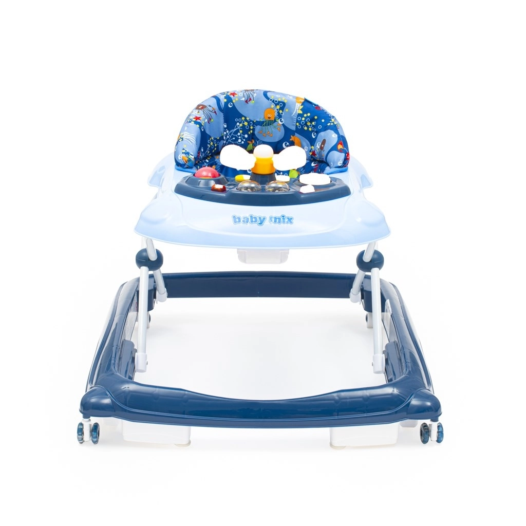 Mergătorul practic și distractiv pentru copii BABY MIX, în culoarea albastru închis, sprijină primii pași și coordonarea mișcărilor. Oferă panou multimedia cu lumini și sunete, volan rotativ cu claxon, 3 trepte de reglare a înălțimii și roți din silicon prietenoase cu podeaua. Pentru siguranță, include sistem special anti-răsturnare și o bază stabilă și largă.