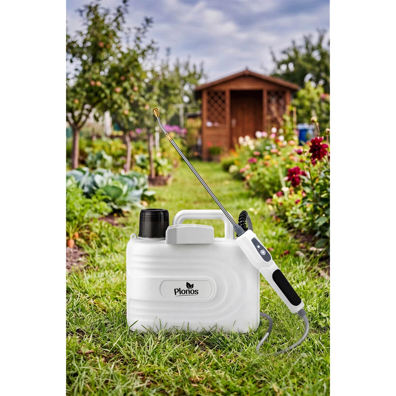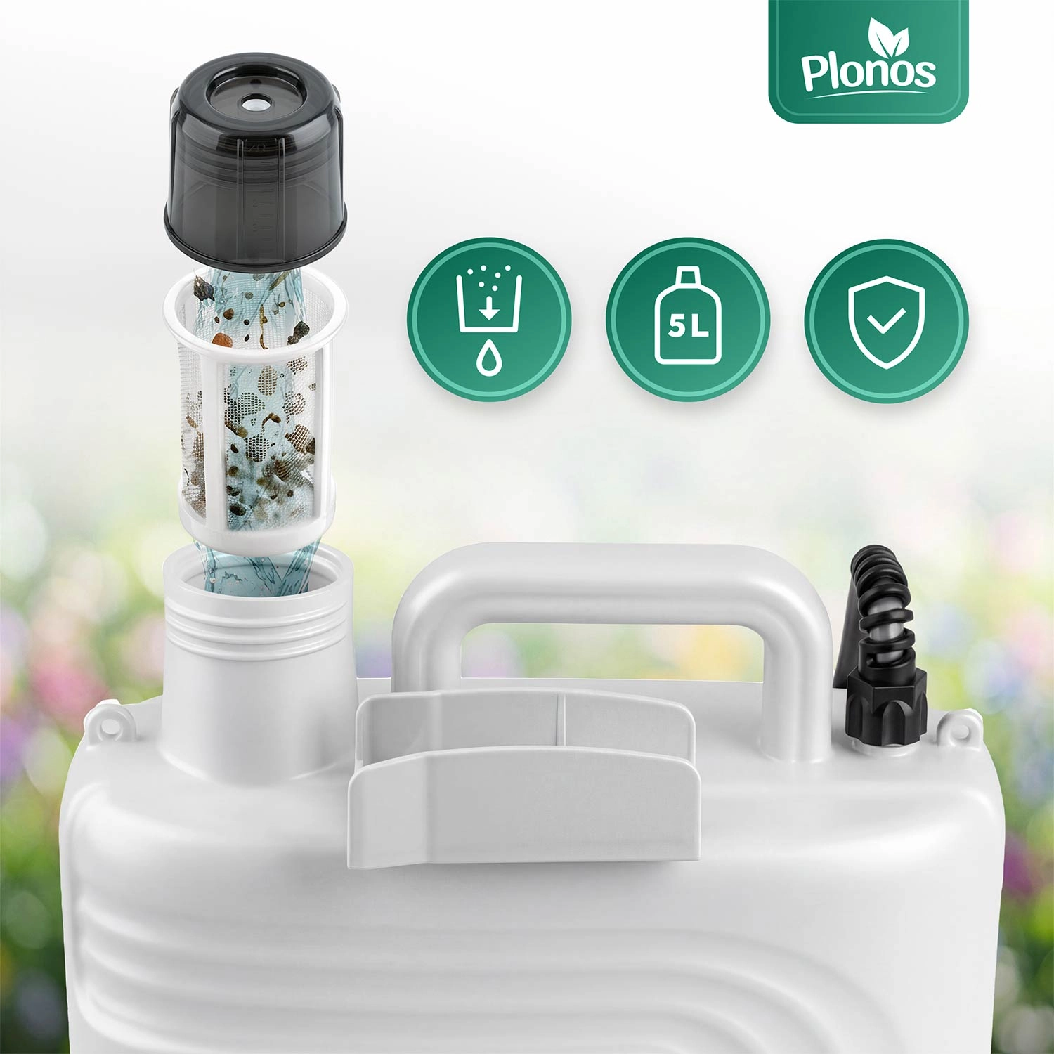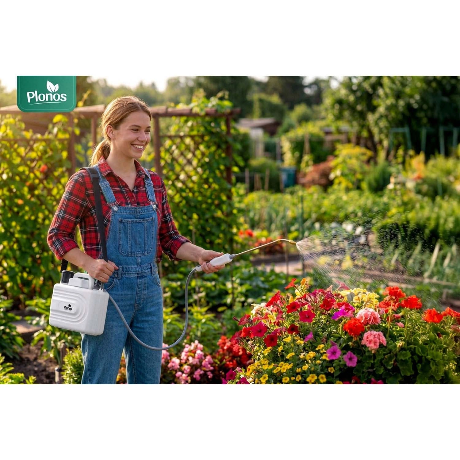 Stropitor pentru grădinari exigenți – stropitorul cu presiune pe acumulator PLONOS 5 l îmbină mobilitatea, puterea și precizia. Printr-o singură apăsare de buton pornești pulverizarea continuă fără pompare manuală, economisind timp și efort. Lancea din oțel inoxidabil și duza din alamă permit reglarea lină de la ceață fină la jet continuu, astfel încât adaptezi cu ușurință aplicarea îngrășămintelor și a produselor împotriva dăunătorilor.
