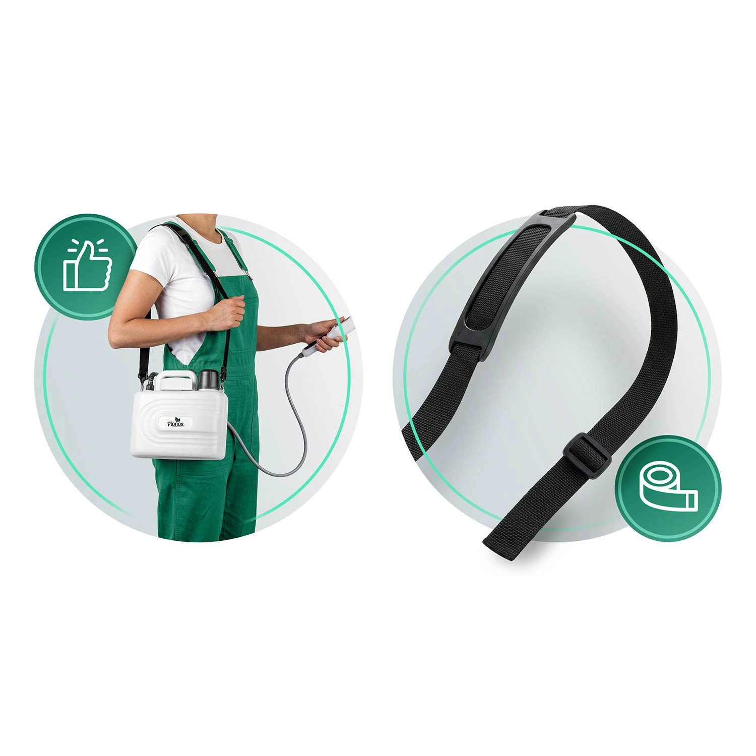 Confort și siguranță la fiecare utilizare datorită bretelelor late, căptușite, cu reglaj, indicatorului LED al nivelului de încărcare și sitei de filtrare împotriva impurităților. Rezervorul PE de 5 l este ușor și rezistent chimic, potrivit pentru grădină, seră și suprafețe mai mari de gazon. Presiunea constantă oferă acoperire uniformă și consum economic de soluții.