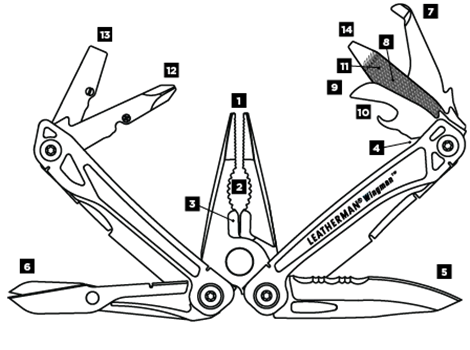 - Clești cu vârf subțire cu mecanism pe arc; clești pentru strângere cu mecanism pe arc; clești tăietori de sârmă cu fălci interschimbabile (oțel 154CM) și mecanism pe arc; lamă pentru dezizolat; cuțit cu tăiș zimțat din oțel 420HC; foarfecă cu mecanism pe arc; deschizător pentru ambalaje tip blister; pilă cu strat de diamant; deschizător de sticle; deschizător de conserve; riglă (1,5" / 3,8 cm); șurubelniță Phillips; șurubelniță plată medie; șurubelniță plată mică