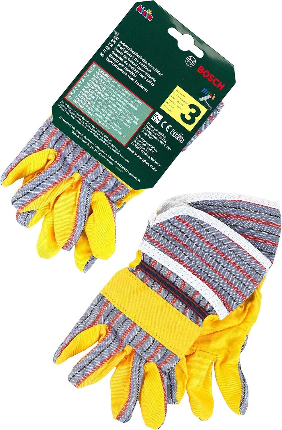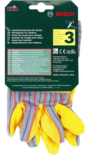 Mănușile de lucru pentru copii BOSCH de la brandul Klein sunt un accesoriu grozav pentru micii meșteri. Reproduc fidel mănușile reale, au palme galbene cu elemente gri în dungi, manșete elastice pentru o fixare mai bună și sunt ideale pentru joaca de-a meșteșugarii și grădinarii.