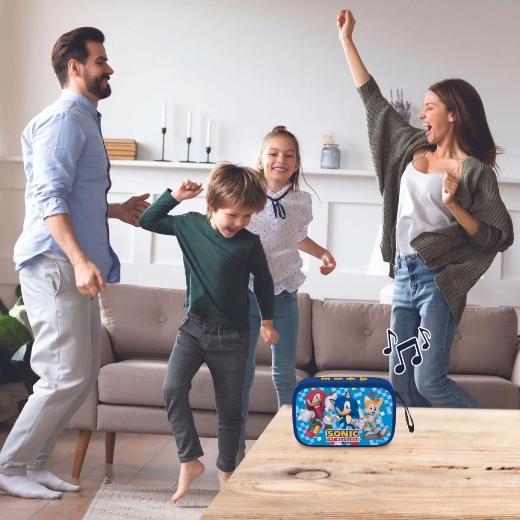Difuzor pentru copii Lexibook cu tematică SONIC, Tails și Knucklesconectivitate Bluetooth fără fir, funcție TWS pentru împerechere stereo, redare de pe USB și microSD/TF și până la 4 ore de ascultare. Design compact cu husă textilă, butoane galbene de control și curea practică, ideal acasă și în călătorii.