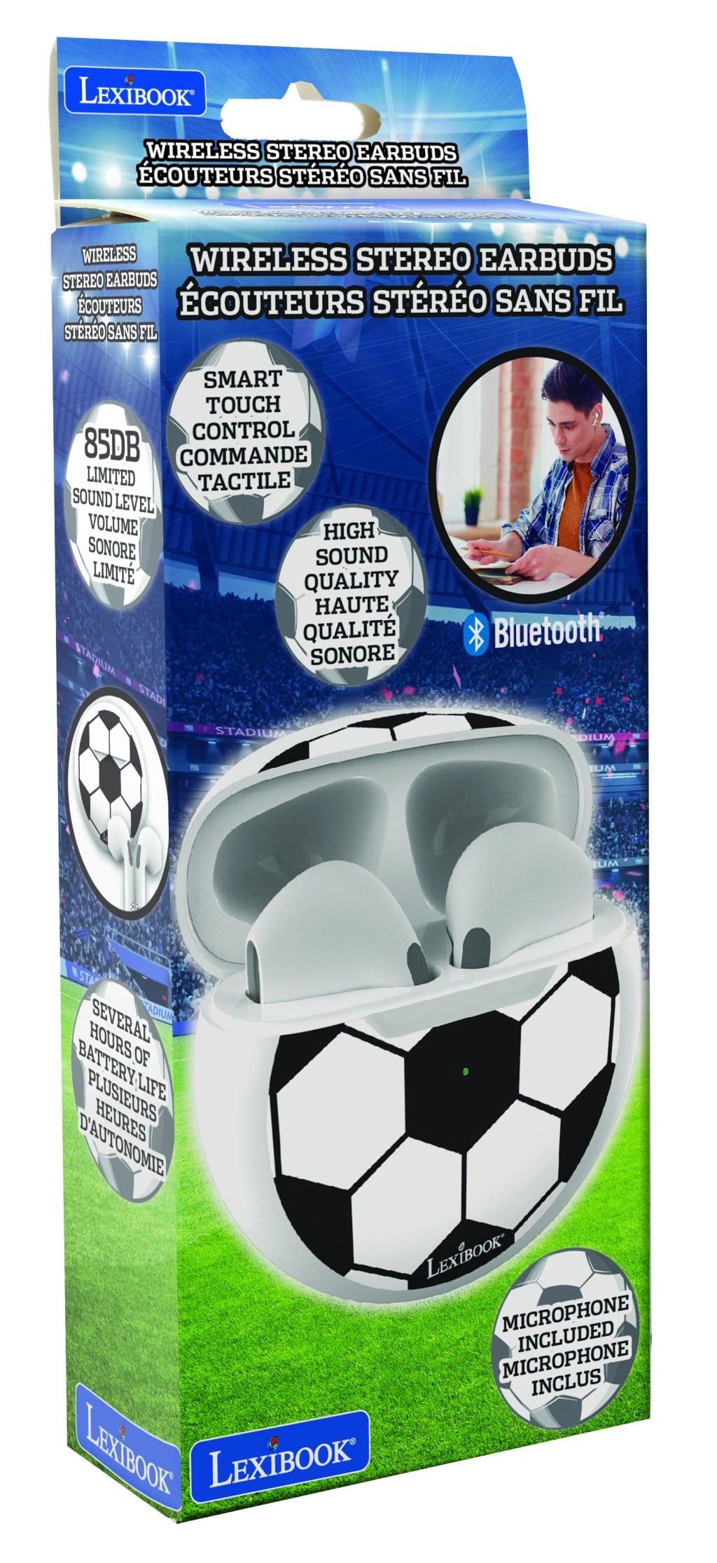Căștile wireless LEXIBOOK Football sunt concepute pentru copii și adolescenți care iubesc stilul sportiv și doresc să asculte muzică, să urmărească videoclipuri sau să apeleze fără cabluri. Construcția ergonomică in‑ear stă confortabil în ureche, în timp ce microfonul integrat și controlul tactil intuitiv asigură o utilizare ușoară zi de zi.