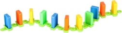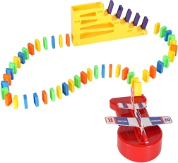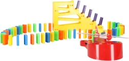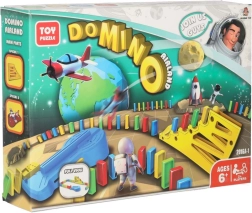 Conținutul pachetului: 126× piese de domino (4 culori), 2× avioane cu lansator, piese de traseu, 2× bile, 1× figurină, 12× suporturi pentru domino, 52× abțibilduri educaționale (litere, cifre, semne matematice).