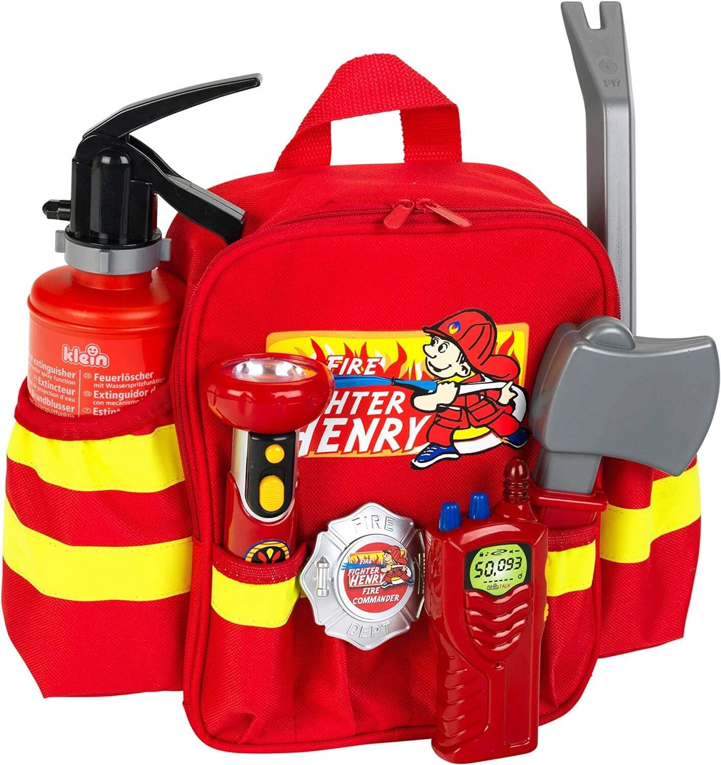 Rucsacul de pompieri HENRY cu accesorii este o alegere excelentă pentru micii eroi care adoră rolurile pline de acțiune. Rucsacul roșu cu benzi reflectorizante transportă în siguranță toate uneltele și este confortabil datorită bretelelor de umăr reglabile. Copiii se vor bucura de dușul de apă din stingător și de lanterna funcțională (cu baterii), ceea ce susține jocul realist de salvare.