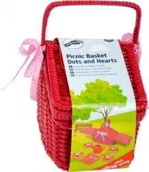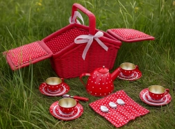 Un coș de picnic fermecător, cu motive de buline și inimioare, ascunde un set de ceai din tablă pregătit pentru orice ceai imaginar. Construcția solidă, cu benzi reglabile cu scai și tiv textil, asigură transportul și depozitarea ușoară a tuturor pieselor. Copiii își dezvoltă interacțiunea socială, motricitatea și creativitatea.
