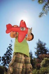 Avionul este fabricat din plastic reciclat din bidoane de lapte – protejează natura și îi învață pe copii sustenabilitatea încă de la vârste fragede.