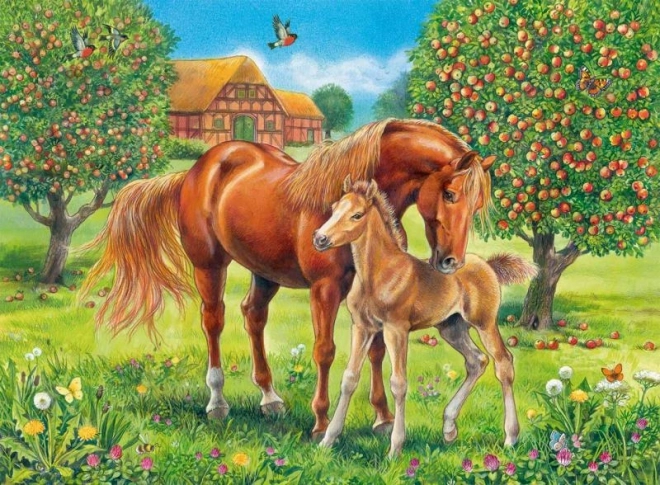 Puzzle distractiv pentru copii, cu motivul unor cai frumoși pe pășune, oferă 100 de piese mari pentru asamblare ușoară.