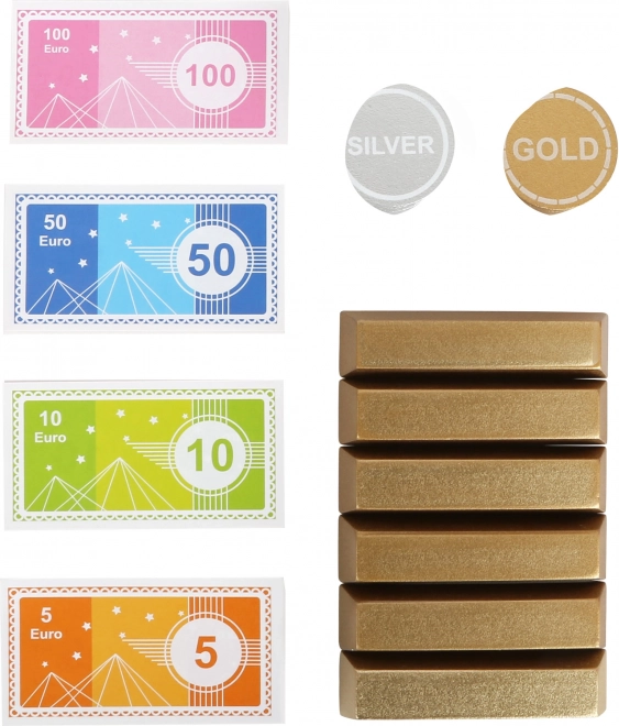 Sunt incluse bancnote euro, monede aurii și argintii, precum și lingouri aurii din lemn. Excelent pentru învățarea valorii banilor, calcule și jocuri de rol cu bancheri și clienți.