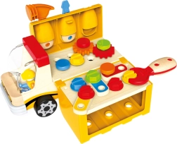 Camion robust ce combină lemnul și plasticul pentru durată de viață îndelungată și manevrare ușoară. Bena rabatabilă adaugă elemente realiste jocului.