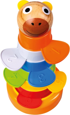 Acest turn vesel îmbină joaca și învățarea într-un singur produs. Șase forme colorate se așază pe o bază stabilă și sunt completate de o bilă în formă de cap de ursuleț din lemn. Copiii pot nu doar să stivuiască elementele, ci și să le introducă unul în altul, să sorteze după mărime sau culoare și să descopere primele numere.