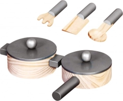 Pachetul include și un set de oale, lingură și furculiță care îmbogățesc experiențele de joc.