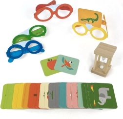 Patru ochelari colorați cu suport pentru cărți, clepsidră și 50 de cărți ilustrate rezistente – gata de joc în doar un minut.