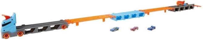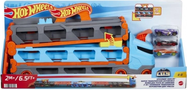 Cu transportorul de curse 2 în 1 de la Hot Wheels poți depozita și expune cu ușurință până la 20 de mașinuțe datorită micilor ferestre din remorcă. Când vine momentul cursei, transportorul se transformă, după desfacere, într-o pistă de curse de 1,8 metri. Vehiculele rămân vizibile sub pistă, iar cabina camionului se transformă într-o rampă dublă de lansare pentru două mașini.
