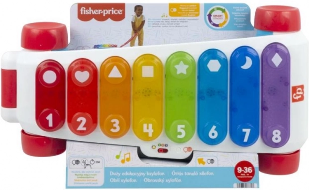 Xilofonul mare educațional de la Fisher-Price este o versiune nouă a clasicei jucării muzicale de tras, acum cu și mai multă distracție! Acest xilofon interactiv de dimensiuni mari oferă 8 butoane iluminate, care activează peste 60 de efecte sonore, inclusiv sunete, cântece și fraze. Jucăria este dotată cu un mâner pliabil solid, astfel încât micii muzicieni se pot juca atât stând jos, cât și în timpul plimbărilor, trăgând xilofonul. Tehnologia nivelelor de învățare permite schimbarea modului de joacă pe măsură ce copilul crește. Expresiile educative și cântecele îi învață, printre altele, alfabetul, numerele și formele, dar și cuvinte simple în limba engleză. Apăsați butonul glob pentru a selecta limba: cehă, poloneză, maghiară, slovacă sau engleză.