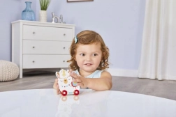 Jucăria este echipată cu patru roți funcționale, care permit manevrare și deplasare facile. Ideală pentru dezvoltarea motricității grosiere și a imaginației copiilor începând de la 12 luni.
