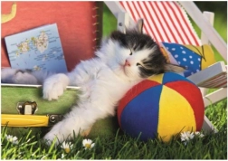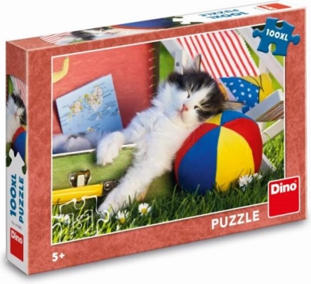 Imaginea colorată a unei pisicuțe adormite cu o minge îi motivează pe copii să asambleze și decorează orice cameră de copil.