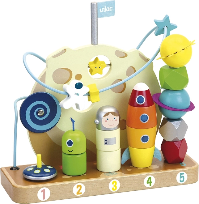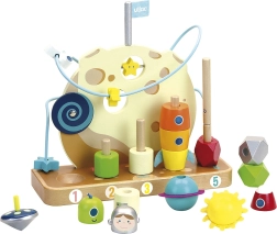Această jucărie stelată din lemn de la Vilac îi poartă pe cei mici într-o lume intergalactică, unde pot stivui planete, număra și glisa stelele pe sârmă. Elementele ingenioase susțin dezvoltarea motricității fine, gândirea logică și percepția culorilor.