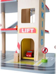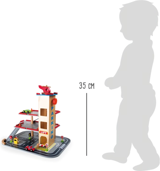 Datorită construcției robuste din lemn, jucăria este durabilă și de lungă durată. Dimensiunile parcării sunt de 35x48x38 cm și sunt potrivite pentru copii de la 3 ani în sus.