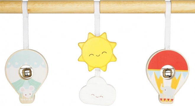 Această arcadă stabilă și sigură pentru copii este creată din lemn de înaltă calitate, cu atenție la siguranța copiilor. Jucăriile colorate sub formă de nor, munți și baloane cu aer cald sunt suspendate pe șnururi textile și sună ușor.