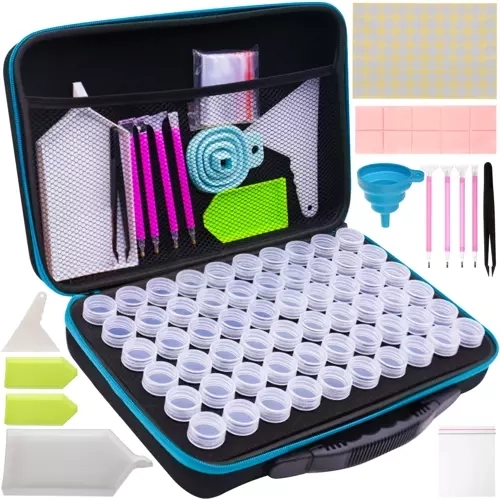 Acest set practic ușurează fiecărui iubitor al picturii cu diamante organizarea și însăși creația. Totul este depozitat în siguranță într-o husă rigidă și durabilă cu fermoar, inclusiv borcănașele așezate ordonat în inserția din spumă și buzunarul din plasă pentru accesorii. Datorită acestei soluții, aveți toate pietricelele și uneltele mereu la îndemână și perfect sortate.