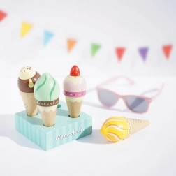 Răsfățați micii vânzători de înghețată! Acest set fermecător include patru cornete pictate manual pe un suport robust. Datorită lemnului de calitate și vopselelor netoxice, jocul este sigur și de durată. Susține imaginația, motricitatea fină și coordonarea mână–ochi și este ideal pentru jocuri de rol.
