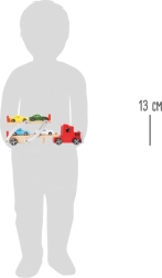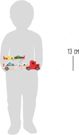 Atenție, se încarcă! Acest camion de lemn cu mașinuțe robust de la small foot transportă până la patru mașinuțe sport deodată. Are platformă superioară mobilă pentru încărcare și descărcare ușoară, barieră de siguranță împotriva rulării înapoi și o construcție durabilă din lemn și metal – ideal pentru micii pasionați de mașini și pentru orice pistă auto pentru copii.