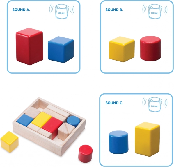 Această construcție compactă și precis realizată combină 6 cuburi zornăitoare colorate și 7 cuburi naturale. Copiii pot compara și potrivi piesele după intensitatea și caracterul sunetului, antrena motricitatea fină și gândirea logică. Cutia servește ca organizator inteligent și totodată ca provocare – a pune cuburile la loc necesită ingeniozitate și imaginație spațială.