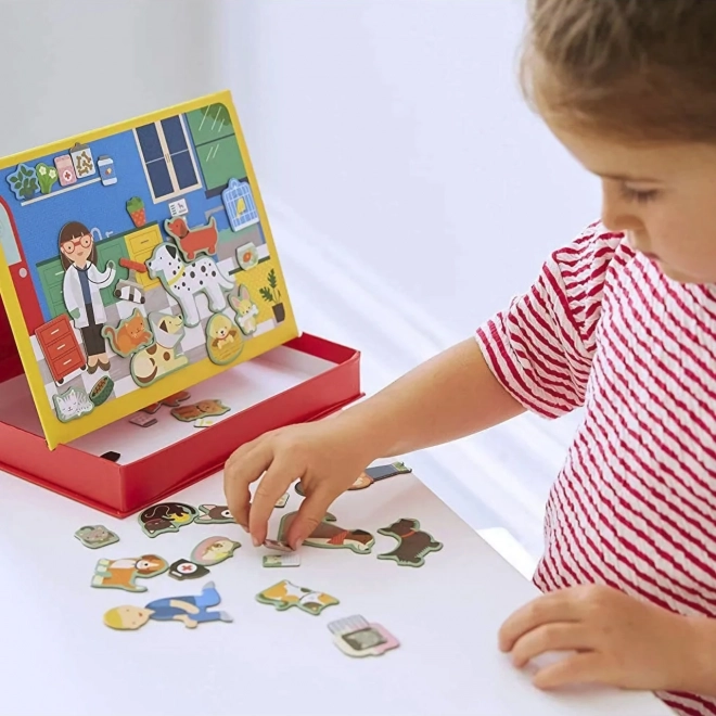 Căutați jucăria perfectă pentru micii iubitori de animale? Joc magnetic: Clinica Veterinară este alegerea ideală! Acest joc conține două table magnetice și 50 de piese magnetice care permit copiilor să creeze propriile povești și scene. Cutia pliabilă practică facilitează depozitarea și curățenia rapidă a pieselor.