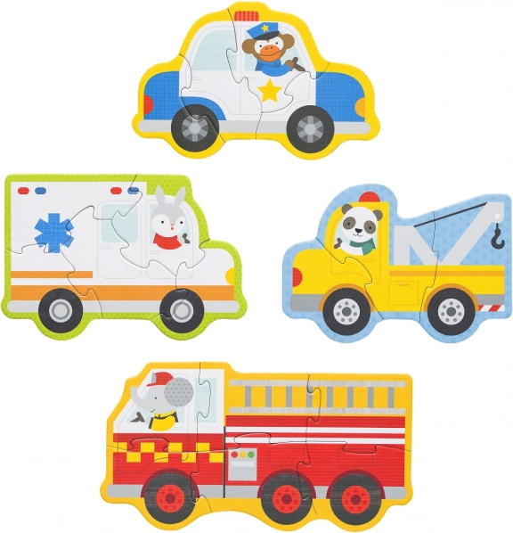 Faceți cunoștință celor mici cu lumea salvatorilor prin ilustrații simpatice – un iepuraș conduce ambulanța, o maimuță mașina de poliție, un elefant autospeciala de pompieri, iar un panda platforma de tractare. Nivelurile diferite de dificultate (3, 4, 5 și 6 piese) susțin dezvoltarea treptată a abilităților, răbdarea și bucuria reușitei.