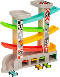 Pista de curse include niveluri diferite și mașinuțe colorate, ceea ce asigură o joacă distractivă și educativă.