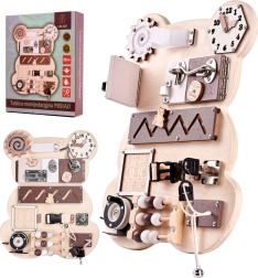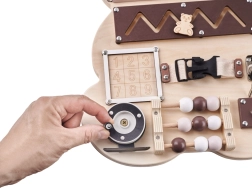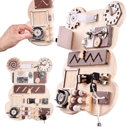 Tablă senzorială de manipulare în formă de ursuleț, concepută pentru a oferi copiilor ore întregi de distracție și dezvoltare. Această jucărie simplă este inspirată de pedagogia Maria Montessori și stimulează creativitatea și imaginația celor mici.