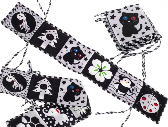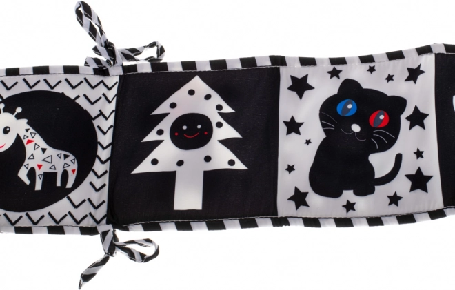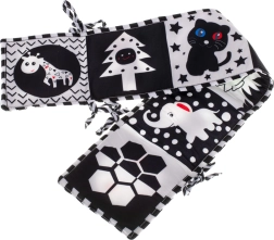 Cartea senzomotorie contrastantă, proiectată ca protecție pentru pătuț, este alegerea perfectă pentru copiii care încep să descopere lumea. Cartea în formă de armonică poate fi ușor fixată de pătuț cu ajutorul șnururilor, oferind nu doar distracție, ci și siguranță.