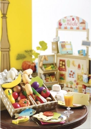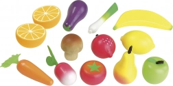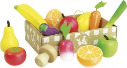 În cutie veți găsi un morcov, o lămâie, o ridiche, un praz, o vânătă, o ciupercă champignon, o roșie, o banană, un măr, o pară, o căpșună și două jumătăți de portocală. Copiii pot exersa astfel în mod jucăuș culorile, formele și sortarea alimentelor.