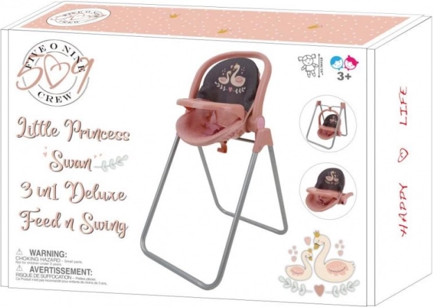Cu acest set universal pentru păpuși, fiecare zi se transformă într-o joacă creativă. Designul elegant roz-gri cu motiv de lebădă se potrivește perfect în camera copiilor și încântă orice mică îngrijitoare. Datorită designului bine gândit, transformi cu ușurință scăunelul în leagăn sau în oușor portabil.