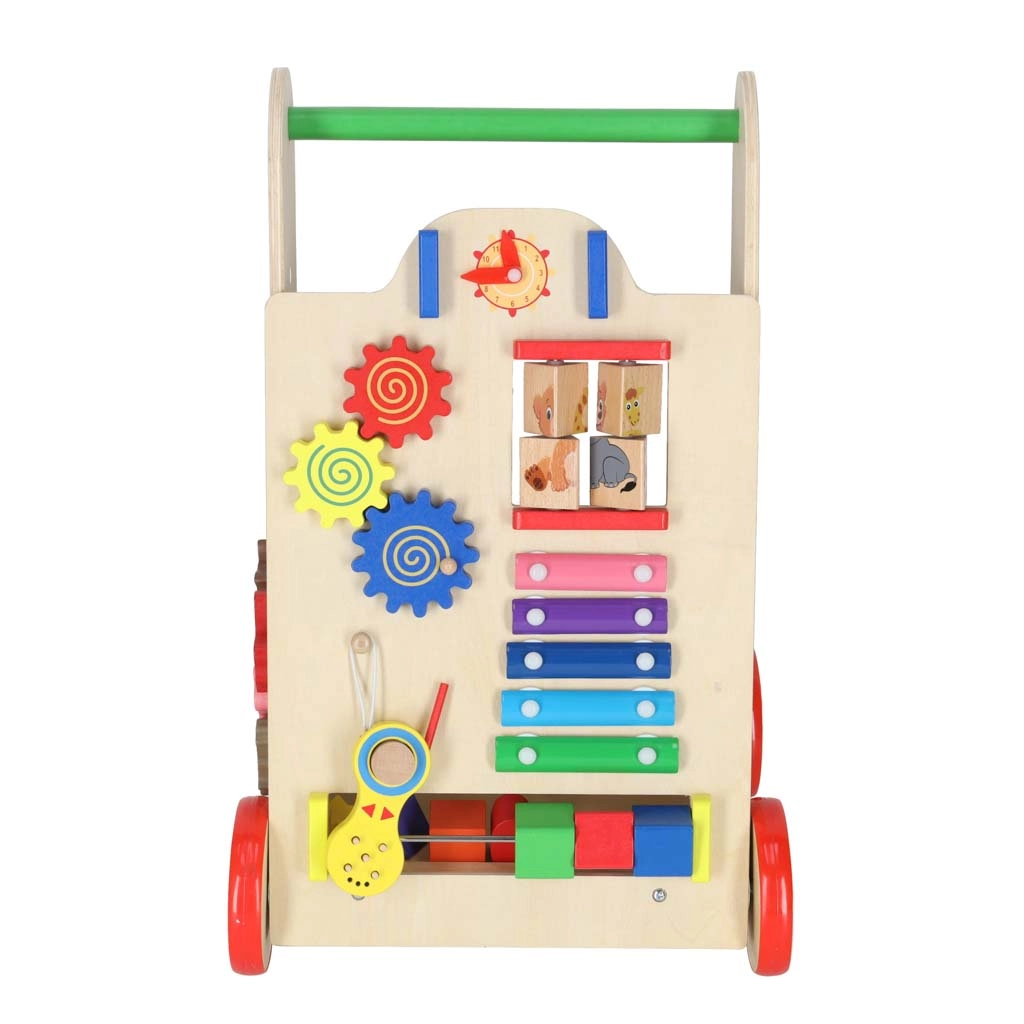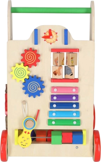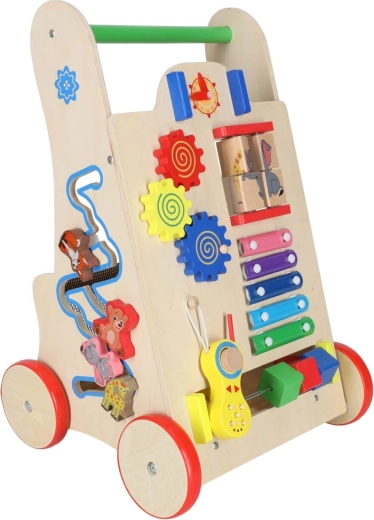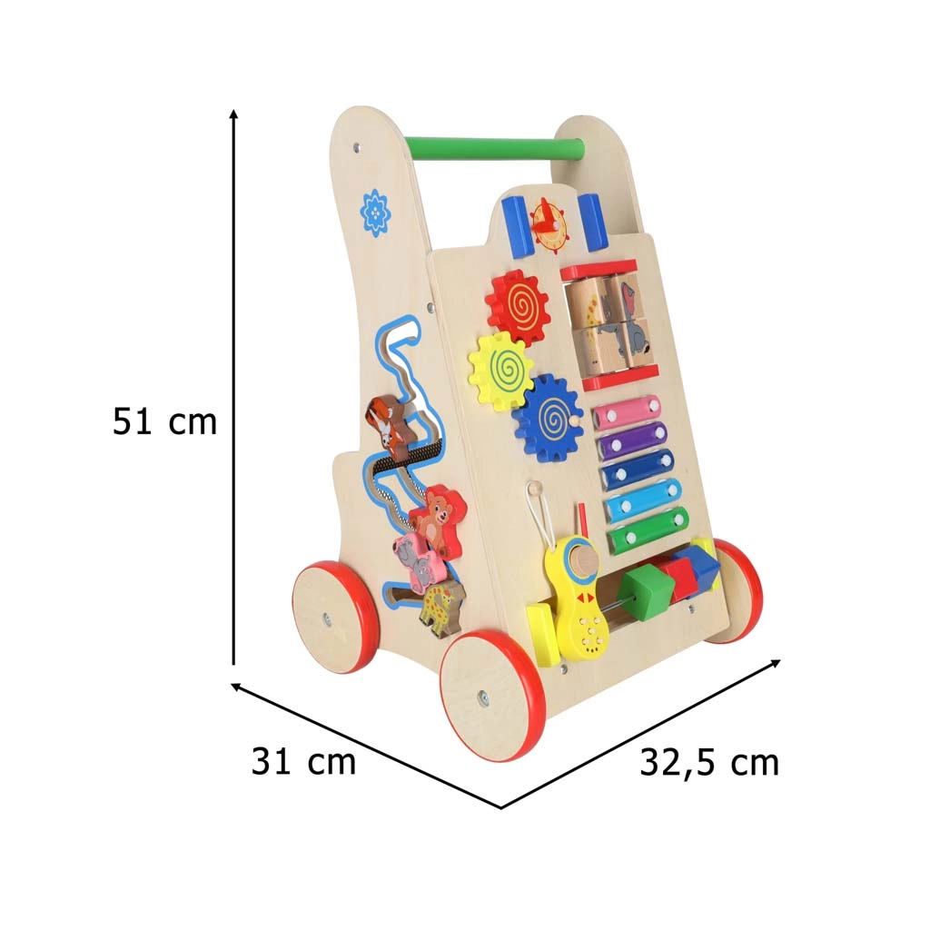 Descoperiți premergătorul multifuncțional din lemn 6 în 1, care combină sprijinul la mers cu un centru educativ într-un singur produs. Panoul frontal oferă activități variate: limbi de ceas mobile, roți dințate rotative, un mic xilofon cu baghetă, elemente glisante și imagini rotative. Părțile laterale sunt completate de sortarea formelor și un distractiv labirint cu animăluțe. Datorită construcției stabile și roților cu cauciuc antiderapant, mersul este mai sigur și mai încrezător.