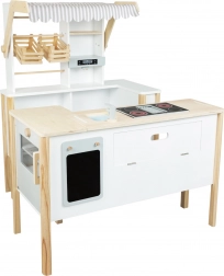 Descoperiți lumea creativă cu standul nostru multifuncțional, care este conceput pentru imaginația ludică a copiilor. Construcția sa transformatoare permite o schimbare rapidă din stand de vânzare în bucătărie sau cafenea. Multifuncționalitatea acestui stand include cântar, polițe rabatabile, tablă pentru desen și chiar un aparat de cafea cu spațiu de depozitare ce include două lăzi. Un adaos minunat este marchiza variabilă, care poate fi pliată pentru a economisi spațiu.