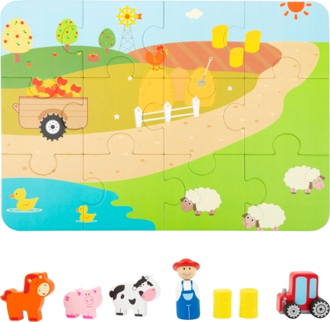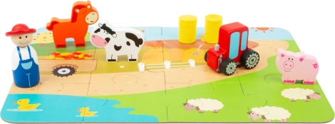 Porcușorul guiță, tractorul huruie. Joc portabil într-o valiză frumoasă; copiii își pot crea propria fermă datorită figurinelor de joc sub formă de tractor, animale domestice și fermier din lemn. Așadar, mai întâi construiți baza din puzzle și apoi puteți începe să vă jucați! Ferma este desăvârșită de figurinele baloților de fân. Cufundați-vă în viața de la țară și lăsați-vă imaginația să zboare. Valiza este din metal rezistent, mânerul este din lemn, încuietoarea se deschide ușor. Potrivită pentru camerele copiilor, săli de joacă... Principalele caracteristici: conține 12 piese de puzzle și figurine: fermier, tractor, purcel, văcuță, căluț și baloți de fân; ambalaj practic – valiză metalică cu mâner din lemn