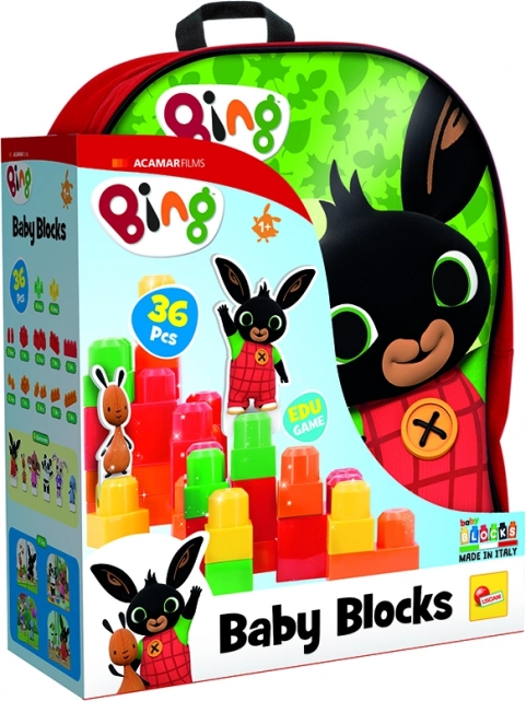 Rucsac cu personajul îndrăgit de copii, Bing. În rucsăcel se află cuburi Baby Blocks pentru cei mai mici și carduri cu personajele din serialul pentru copii îndrăgit. Vârsta recomandată: de la 1 an.
